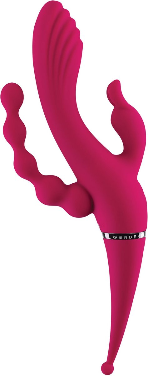 Deze krachtige vibrator biedt vier stimulatiepunten verspreid over 27,5 cm. Het centrale gedeelte heeft twee verschillende uiteinden - een zacht gebogen kant met een bolvormige, gestructureerde punt en een dun, puntig rond uiteinde voor gerichte stimulatie. Aan beide zijden zijn er nog twee stimulatoren - een krachtige rabbit met trillende oren en een forse kop, en een slanke, gebogen kralenschacht die soepel meebeweegt met je lichaam. Met een bedieningspaneel met 2 knoppen kun je 3 motoren tegelijkertijd activeren, met een aparte knop voor de puntige stimulator. Ontdek welke fantasieën deze vibrator met vier stimulatiepunten kan waarmaken dankzij zijn talrijke mogelijkheden. Hij is volledig oplaadbaar, waterdicht en eenvoudig schoon te maken.