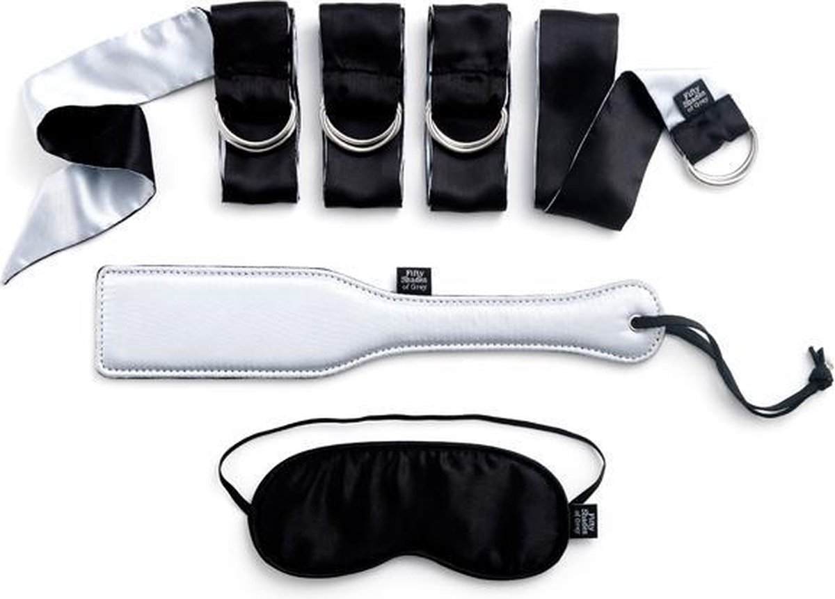 Verken je Christian Grey en Anastasia Steele fantasien met de officile Fifty Shades of Grey slaapkamer bondage geschenkset. 4 bondage hoofdsteunen, een blinddoek en een spanking paddle zijn inbegrepen om je erotische bewustwording mee te nemen van de bladzijde naar de slaapkamer.Materiaal: satijn