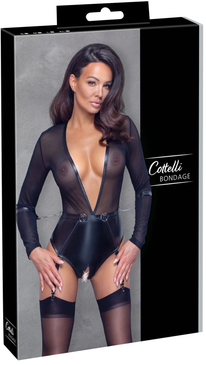 Extra laag uitgesneden jarretelbody van Cottelli BONDAGE met transparante powernet top met lange mouwen en volledig kruisloos pantygedeelte in trendy matte look - ideale spontane sexoutfit! Stevig genaaide riem met 2 ringen aan de voorkant en een ring aan elke kant voor het vastmaken van de bijgevoegde handboeien met karabijnhaakkettingen. Handboeien met verstelbare klittenbandsluitingen. De verstelbare bretels zijn afneembaar.
