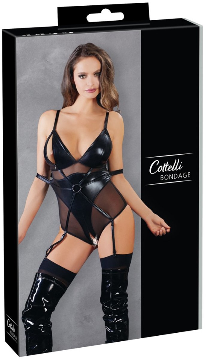 Deze zwarte bondage body uit de Cottelli Collection is perfect voor spannende spellen in de slaapkamer. De body is sexy, comfortabel om te dragen en laat jou en je partner op een subtiele wijze kennismaken met bondage. De doorschijnende body is voorzien wat wetlook stukken op de cups, het kruis en de taille. Deze bedekken de intieme zones maar maken het wel mogelijk ze bloot te geven tijdens spannende momenten. De cups en het kruis zijn namelijk voorzien van ritsjes waarmee je zelf kunt zorgen voor open cups en een open kruis. Aan de achterkant van de body zijn een paar wetlook sierboeien geplaatst.