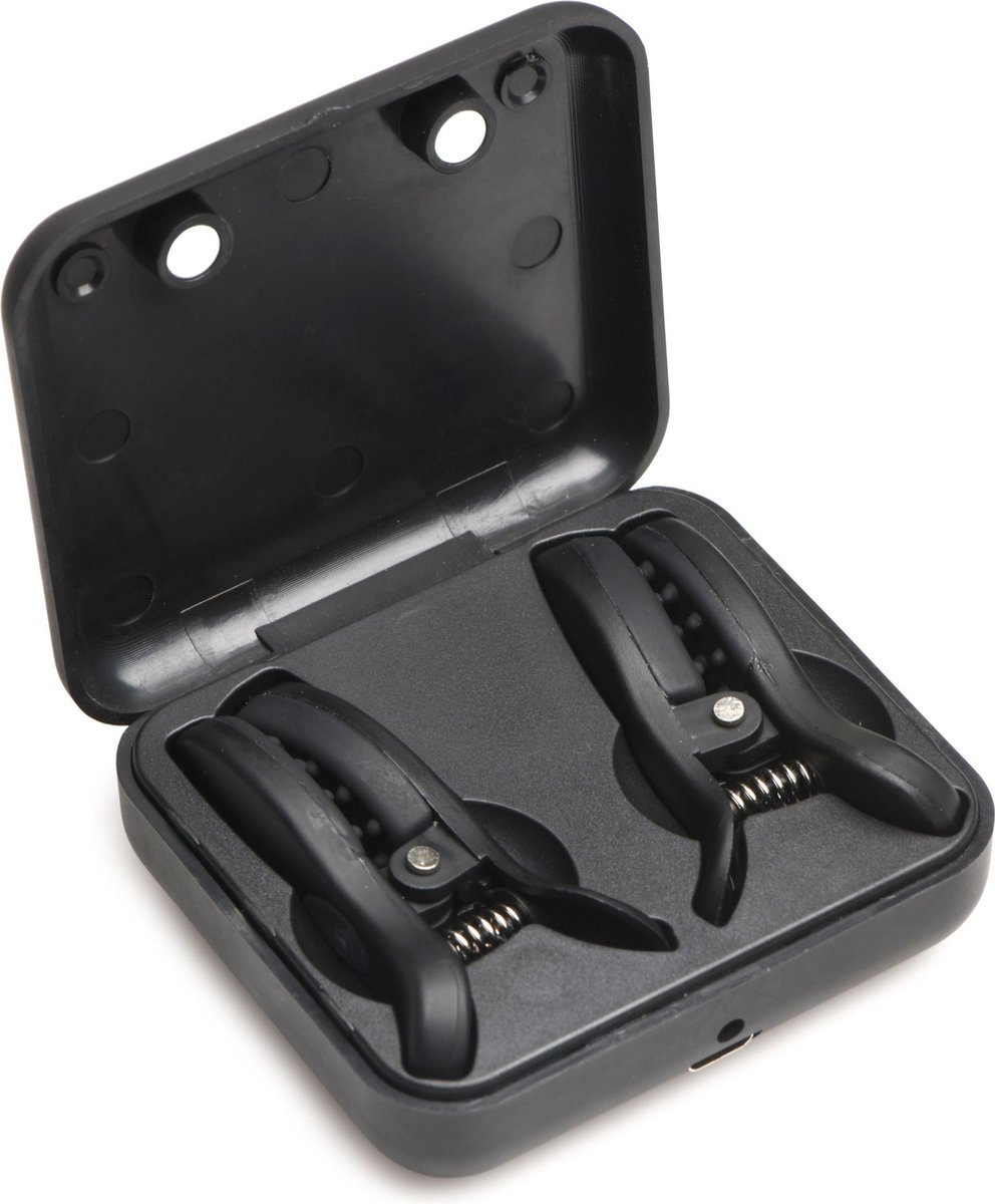 Opladen is heel eenvoudig dankzij het stijlvolle, reisvriendelijke Master Series-doosje, dat je klemmen schoon en gebruiksklaar houdt voor het volgende avontuur. Bovendien past het doosje met de klemmen erin makkelijk in je tas of koffer, zodat je ze discreet kunt meenemen en zelfs in het doosje kunt opladen.