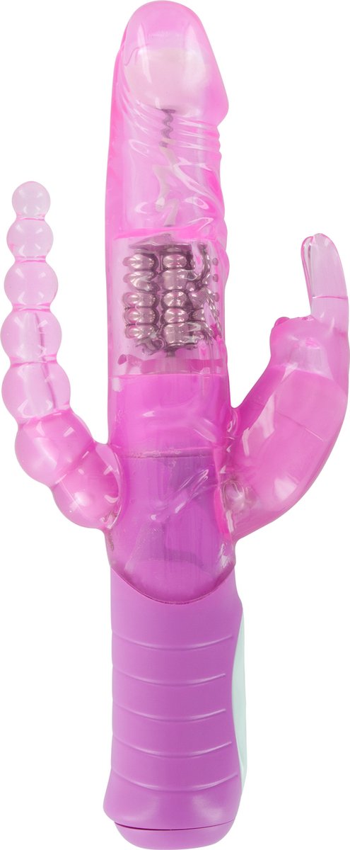 Het plezier dat deze vibrator jou geeft zul je nooit ergens anders ervaren! Je wordt niet op één plekje gestimuleerd, maar op maar liefst 3 verschillende plekjes. Terwijl de schacht jou diep van binnen penetreert met zijn roterende parels, doen het clit konijntje en de anale kralen het andere werk met hun krachtige vibraties. Je kunt de schacht in één richting laten roteren, terwijl de externe stimulators voorzien zijn van een krachtige bullet met 7 verschillende vibratie patronen. De vibrator is volledig waterdicht, dus ook een ideaal speeltje voor waterpret onder de douche!